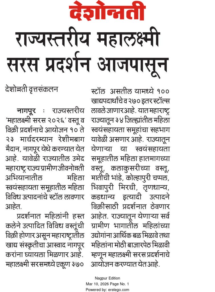 The inauguration of the state-level Mahalaxmi Saras exhibition is being held tomorrow, Wednesday, March 11, 2026 at 9.30 am. For this, all the Hon. Heads of Departments and Hon. Group Development Officers will be present at Reshim Bagh Ground at 9.00 am.
