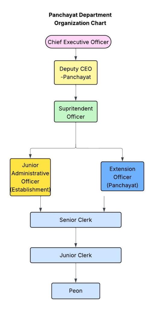 - Village Panchayat Division Zilla Parishad The head of the division is a Class 1 officer of the State Government. His designation is Deputy Chief Executive Officer (Village Panchayat). He has an Assistant Group Development Officer of Class-II to assist him. The entire control of the Village Panchayat is maintained through the Panchayat Department. Also, various schemes of the central and state governments are propagated and implemented in a very excellent manner through this department. There are a total of 776 gram panchayats in the district in 14 Panchayat committees. For this, 722 Gram Sevak and 54 Gram Development Officers and 21 Extension Officers (Panchayat) are available at Panchayat Samiti level.